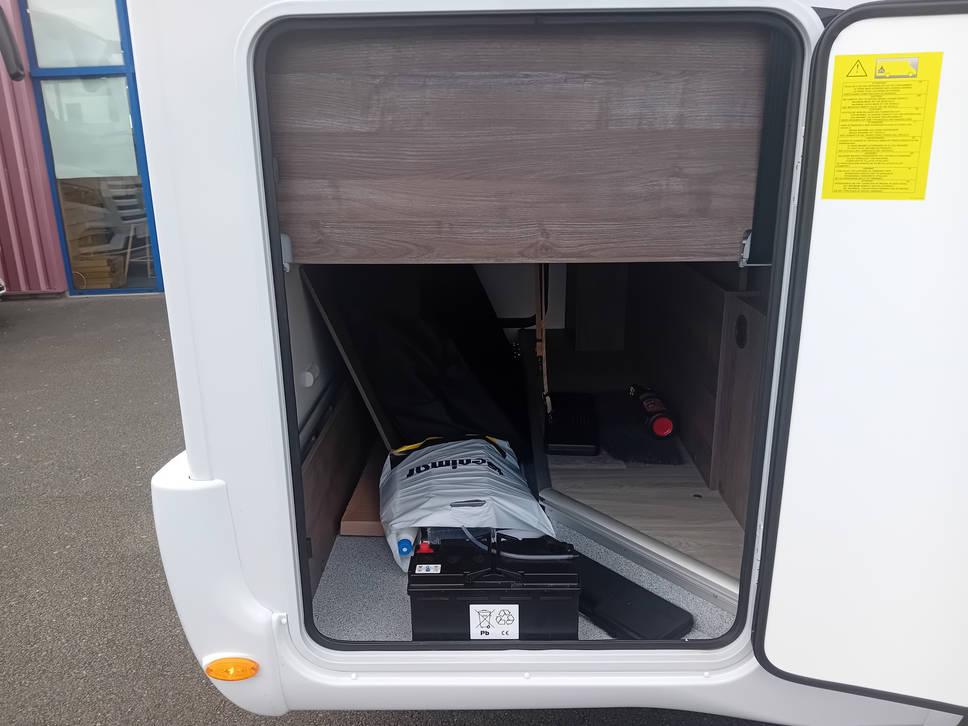 - Kit départ (batterie 12 V, 2 cales, rallonge 230 V, tuyau eau, liquide WC, extincteur, gilet jaune, 2 triangles)