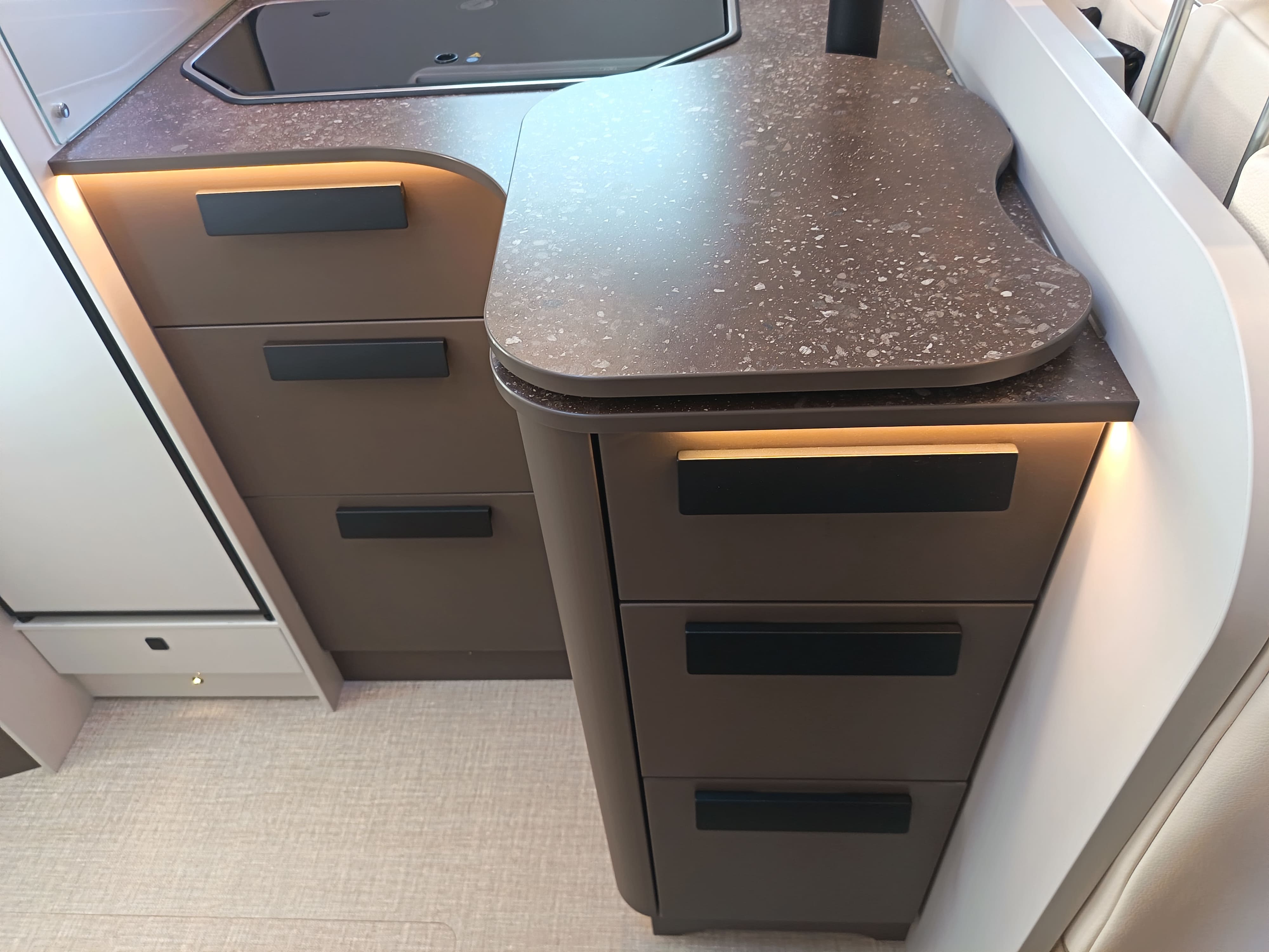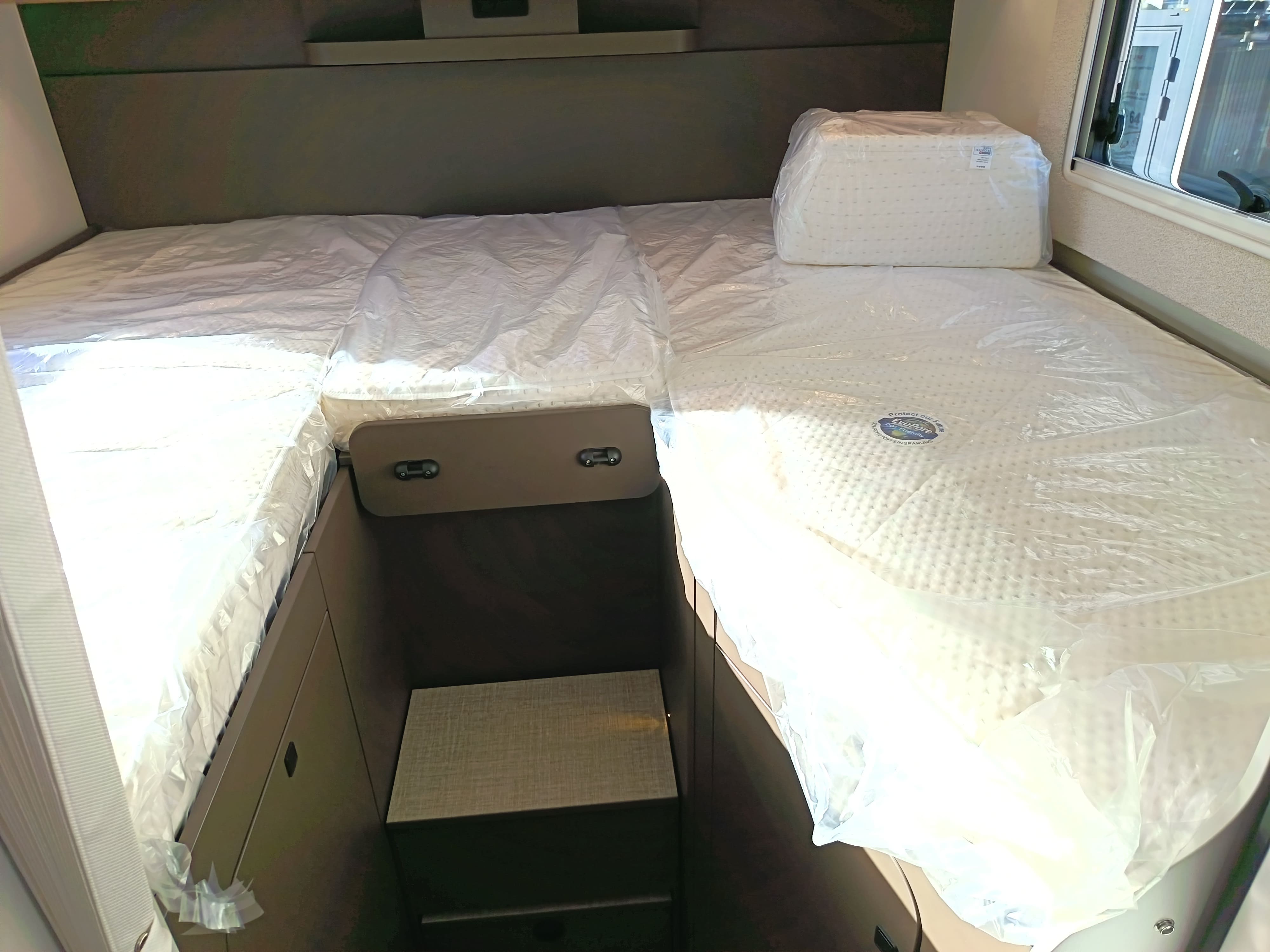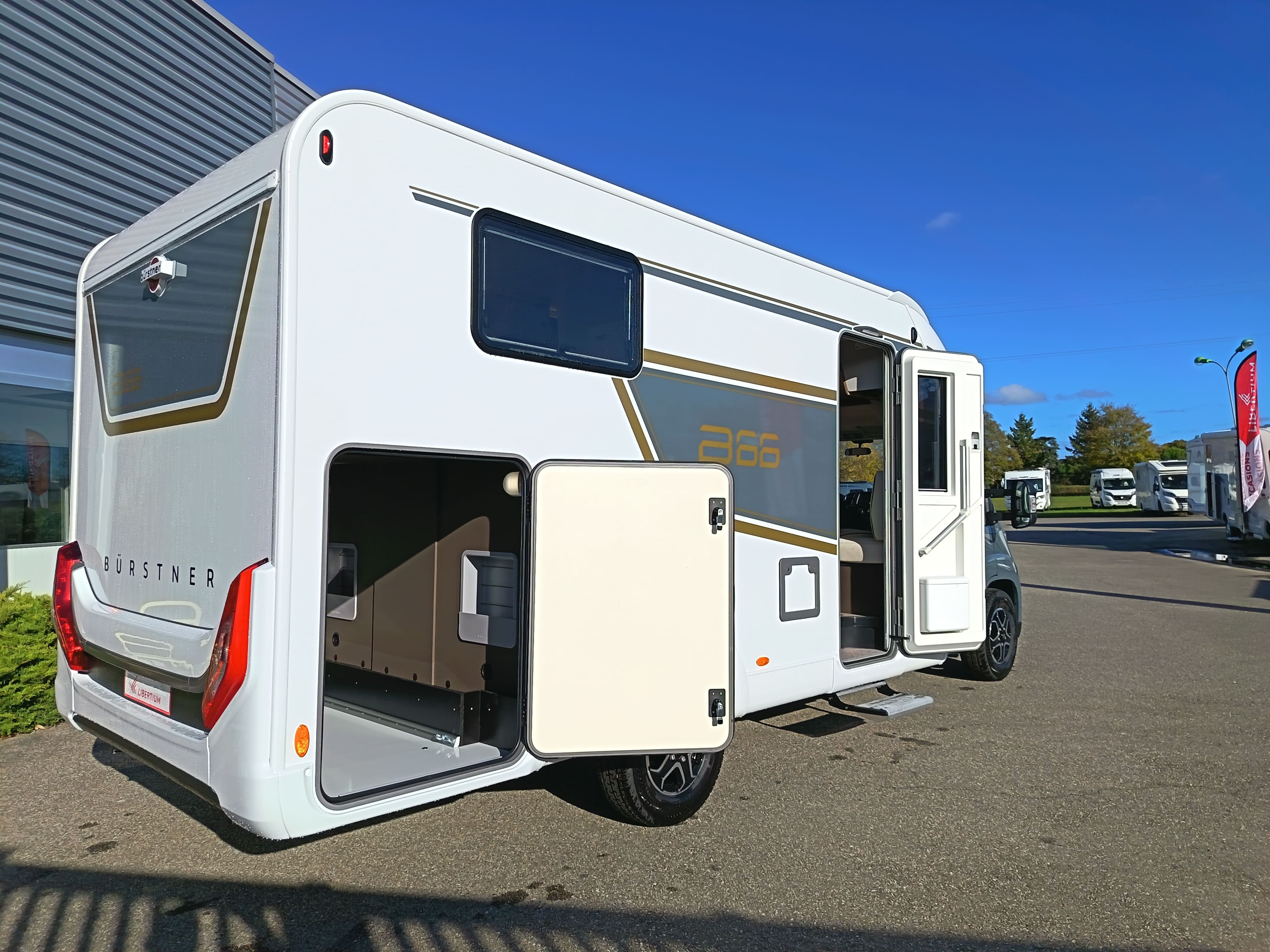 Série limitée BURSTNER avec lits jumeaux sur soute, lit de pavillon électrique 2 places, salle de bain vario et grande soute garage. Ce profilé haut de gamme possède un double plancher et niveau d'équipement de série très riche.