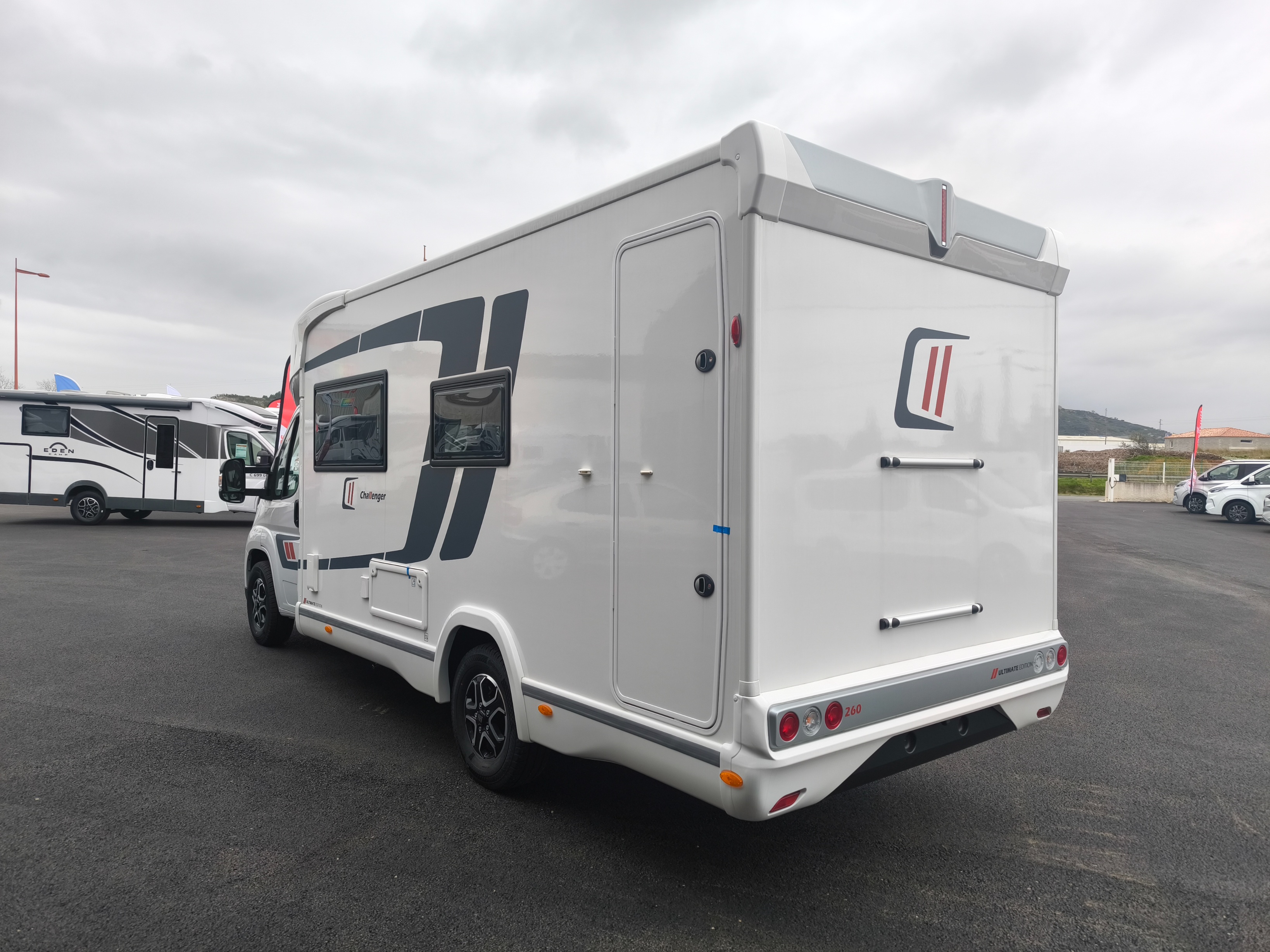 Challenger 260 Ultimate Edition – camping-car profilé de moins de 7 m, très bien équipé et facile à conduire. Implantation moderne avec grand salon face-face très convivial, lit pavillon électrique 2 places et possibilité de couchage supplémentaire, permettant d’accueillir jusqu’à 4 personnes. Salle de bain spacieuse avec douche séparée pour un confort optimal en voyage