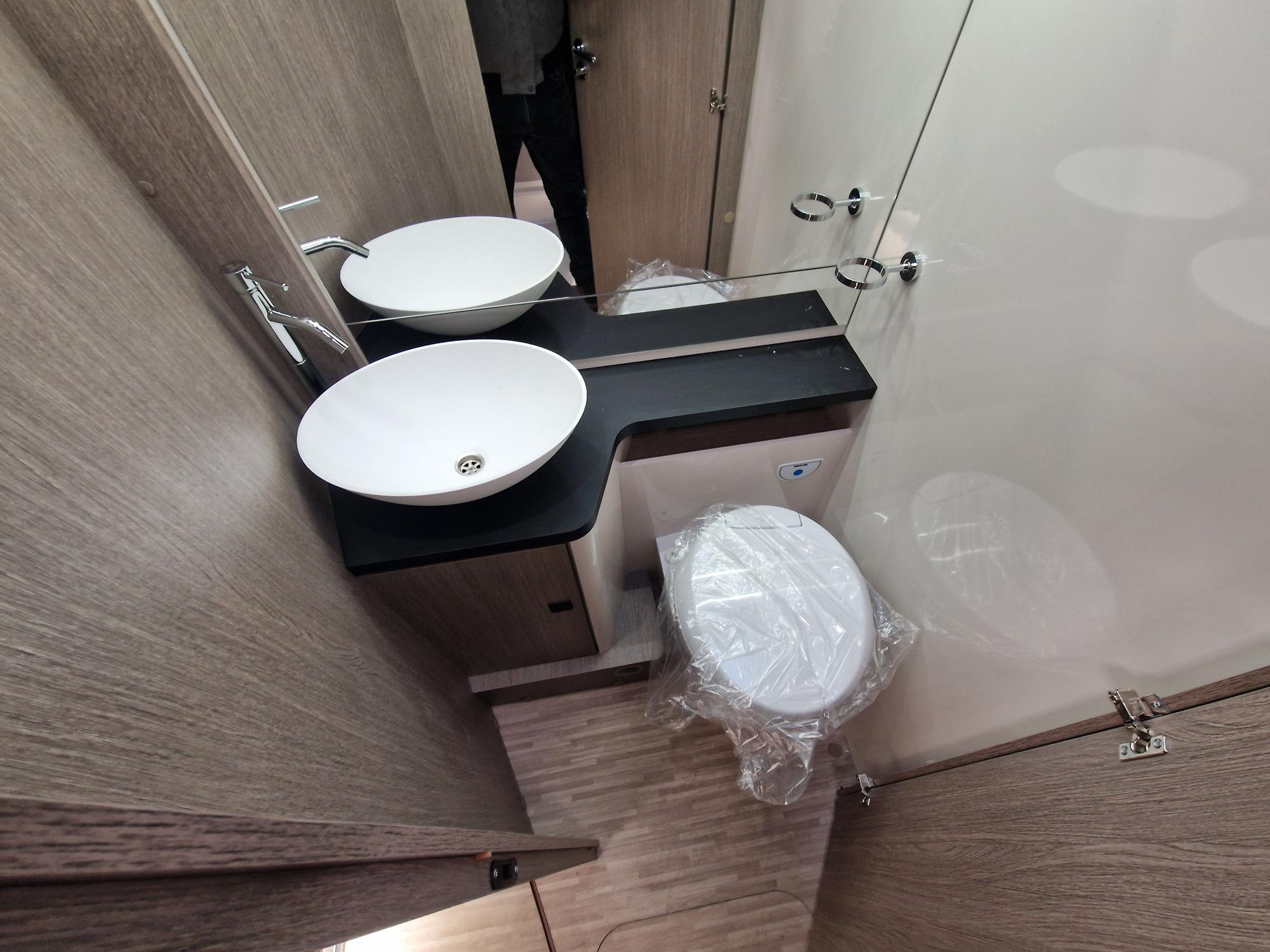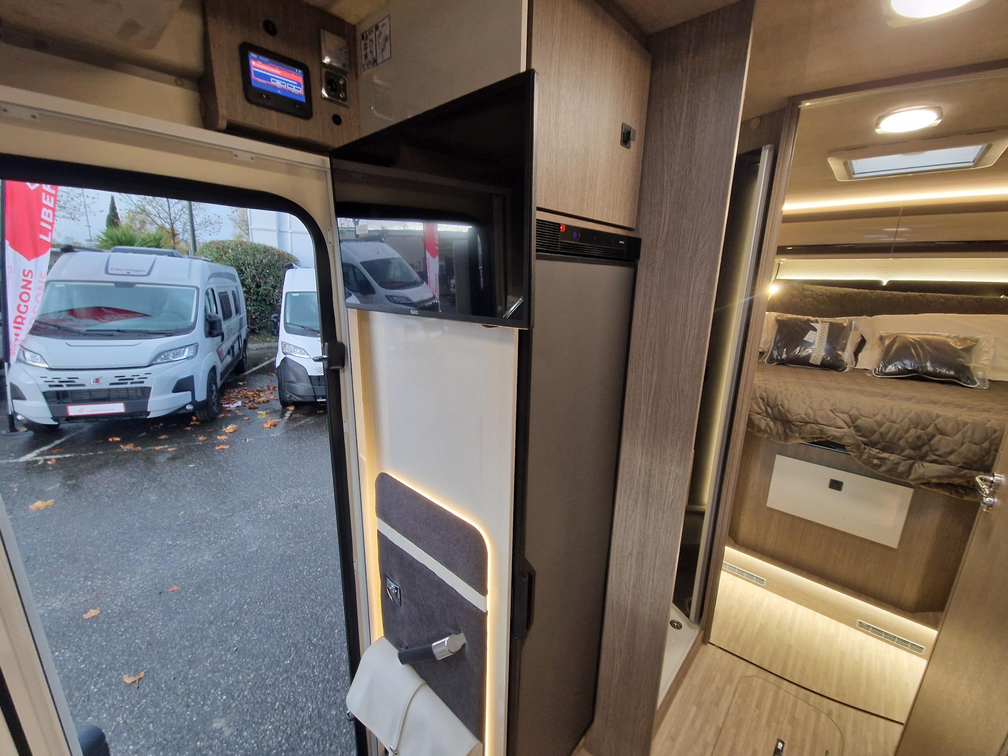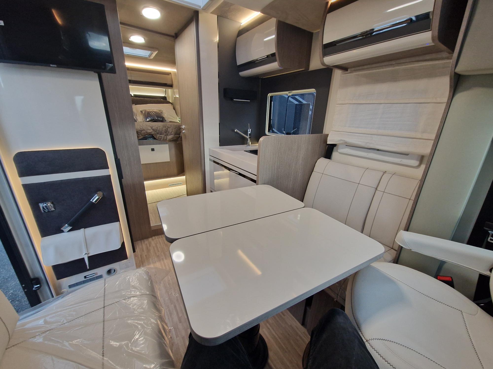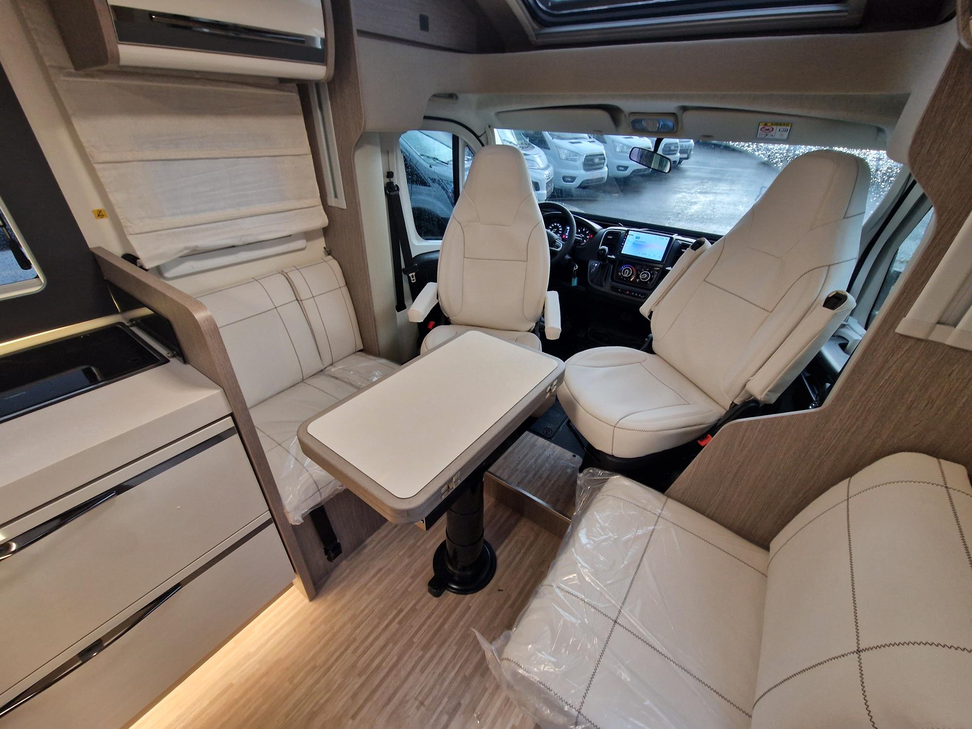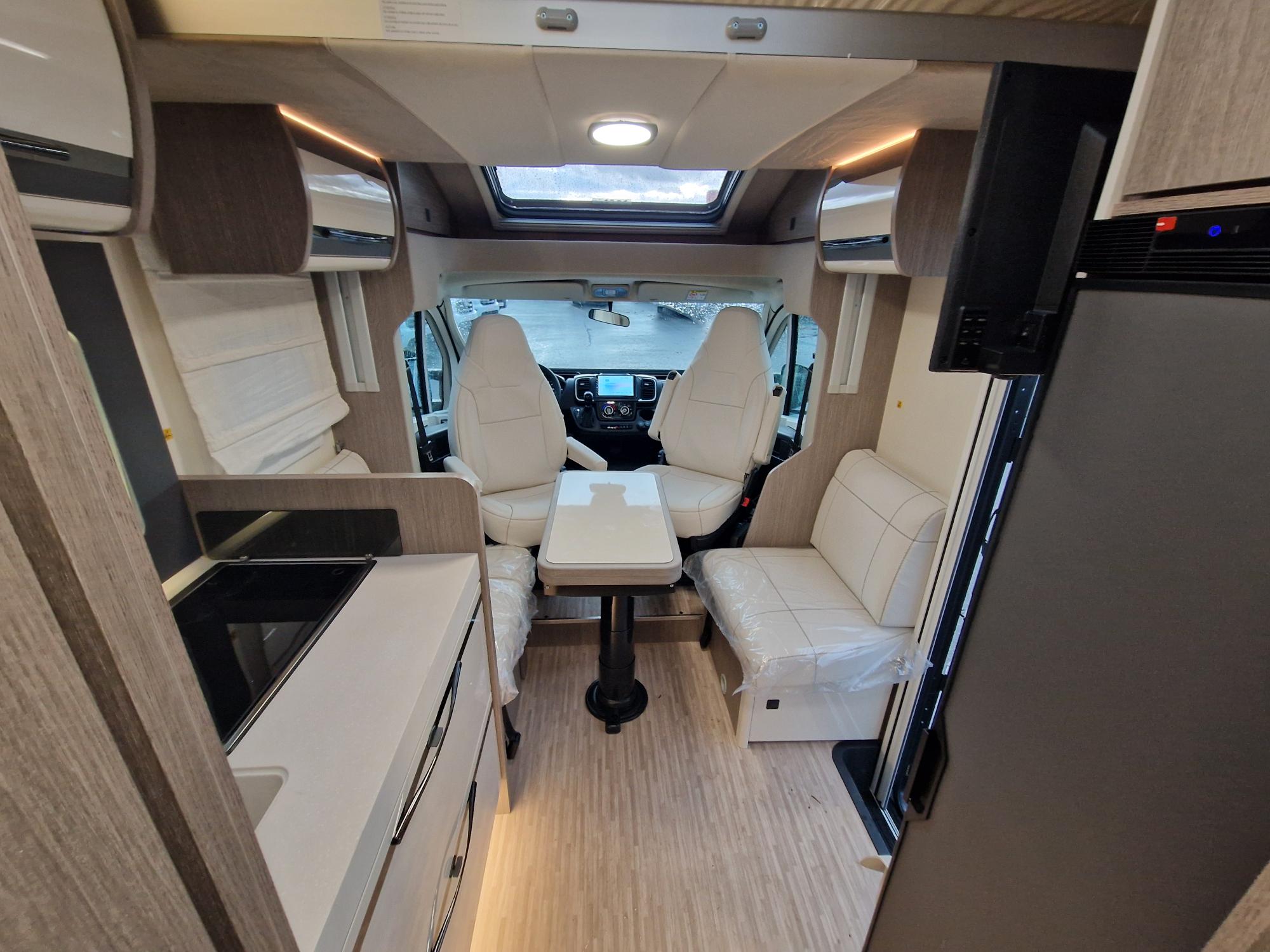 Profilé étroit avec lit central et lit de pavillon électrique 1 place et dinette transformable en 4 éme couchage. Super équipé de série, sur une base Fiat 140 CV en boita automatique.