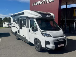 Modèle compact avec maxi salon et lit pavillon, il y a aussi une grande soute le tout sur une longueur de 6m39. douche séparée et grand rangement avec le dressing