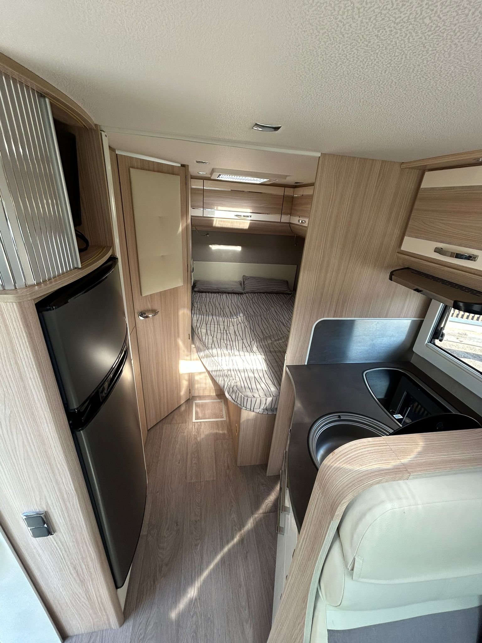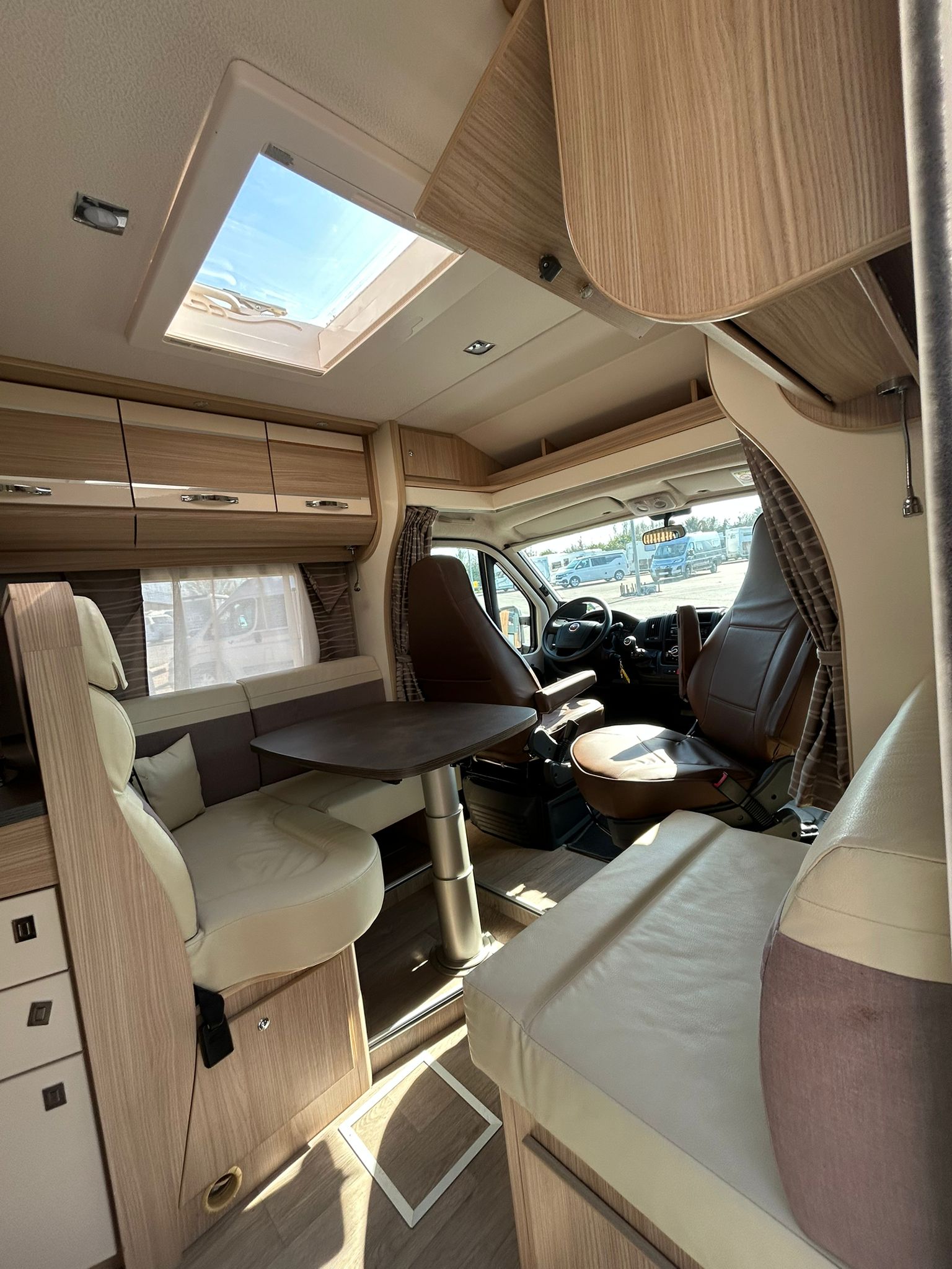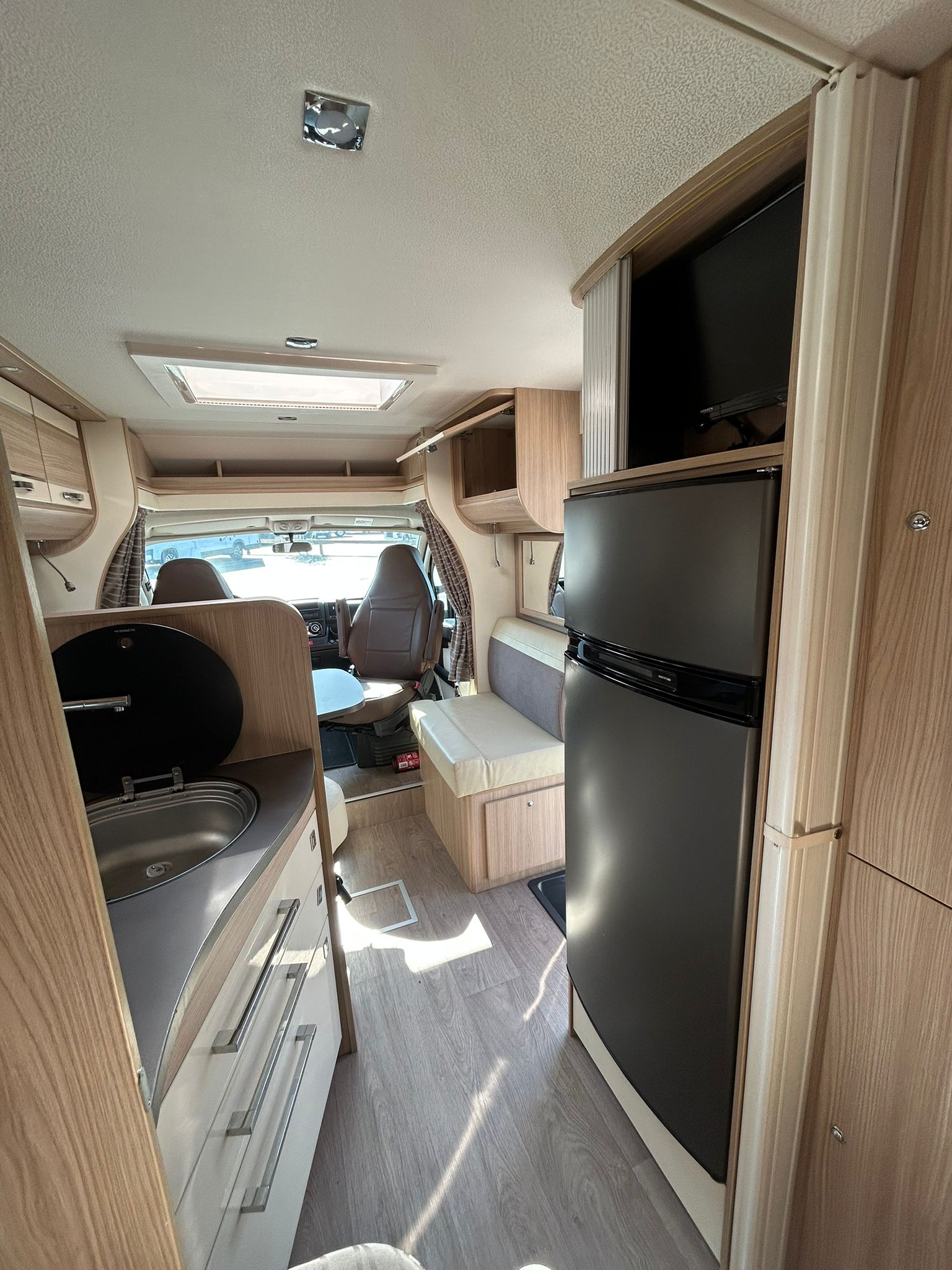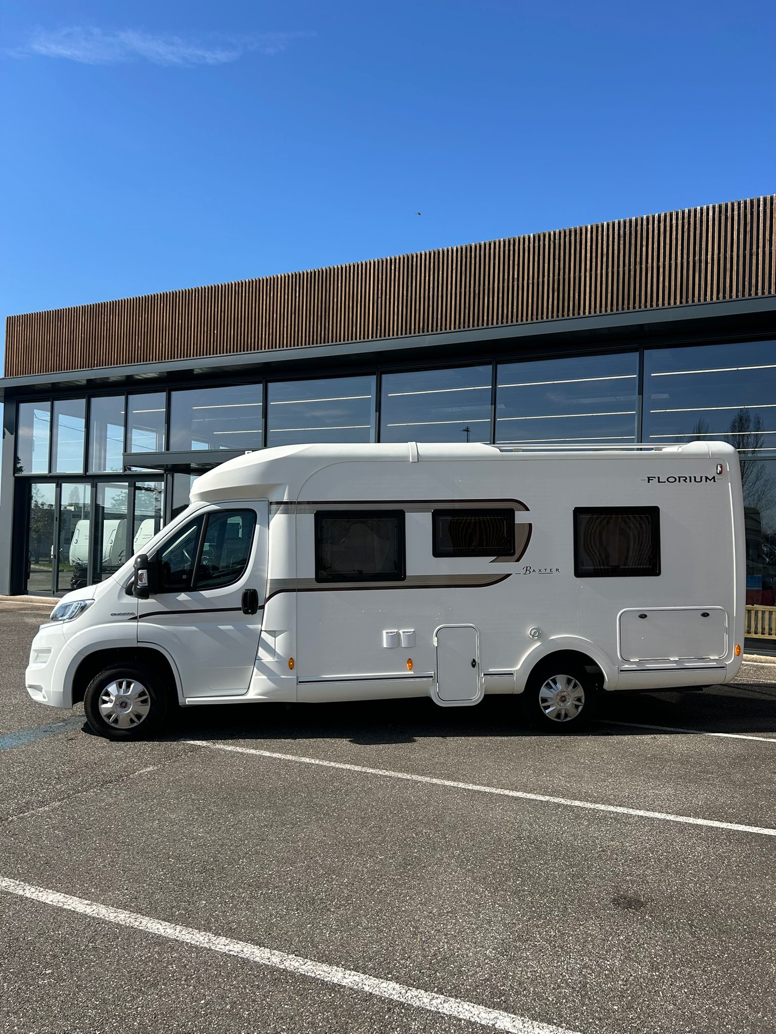 Florium Baxter 64 LG 2018 Profilé (6.47 m). 4 places carte grise / 3 couchages. Motorisation fiable lit à la française confortable à l’arrière, salon avant spacieux avec banquette, cuisine équipée avec espace de préparation suffisant, salle d’eau avec douche, frigo 150L et plusieurs rangements bien répartis. Intérieur fonctionnel et chaleureux, confort correct pour les trajets et la vie à bord, idéal pour des escapades en toute simplicité à bord d’un profilé pratique.