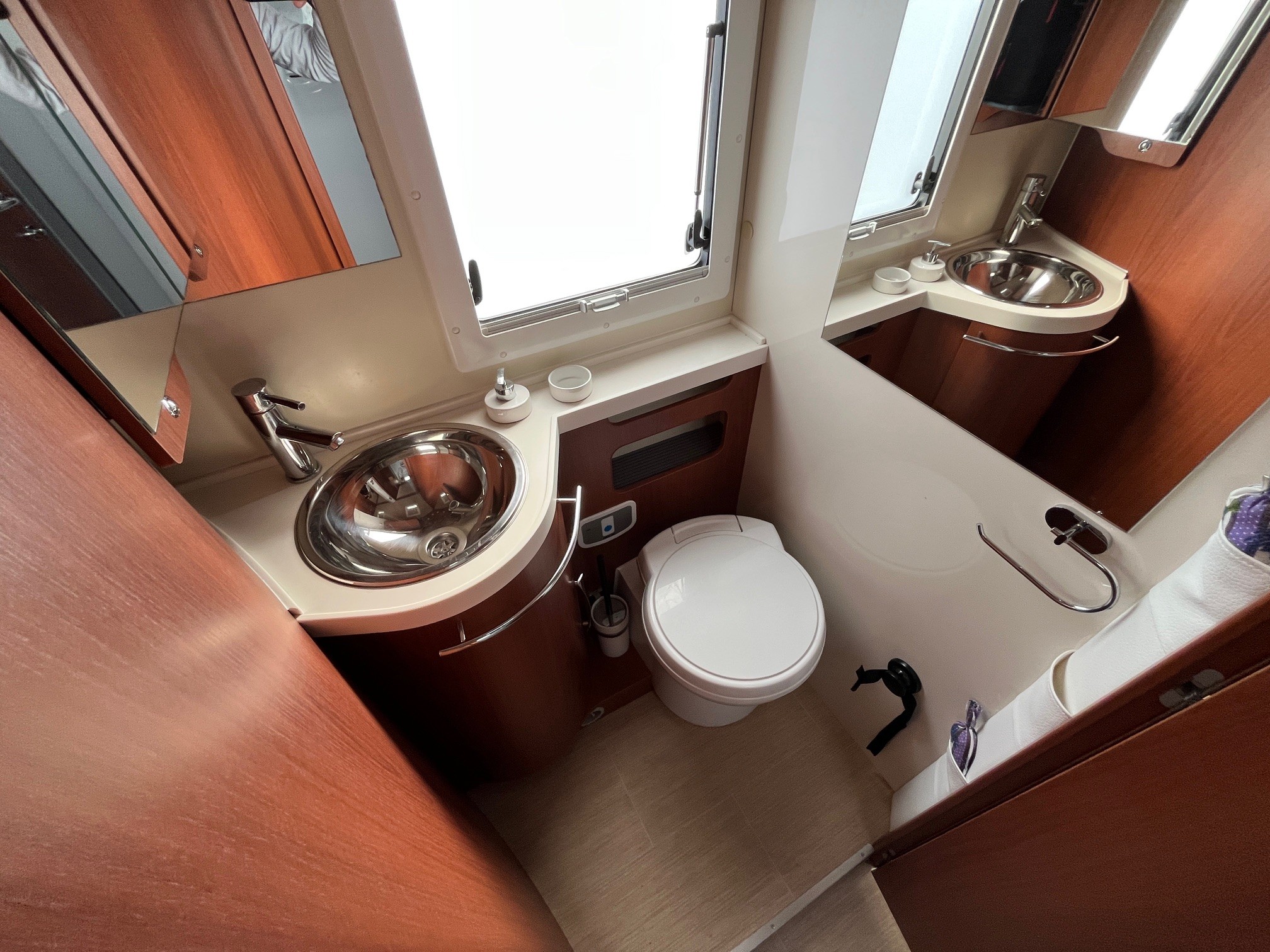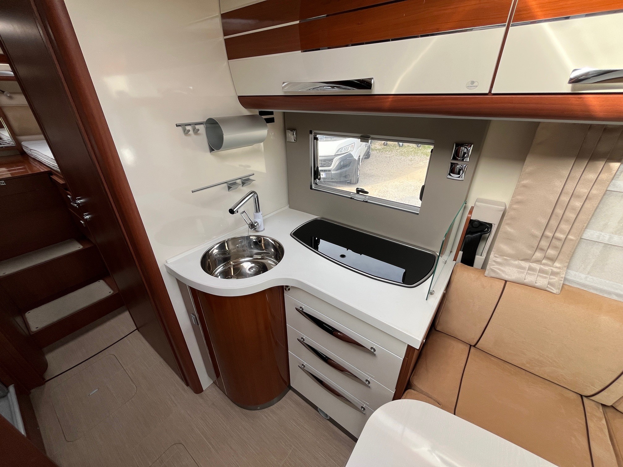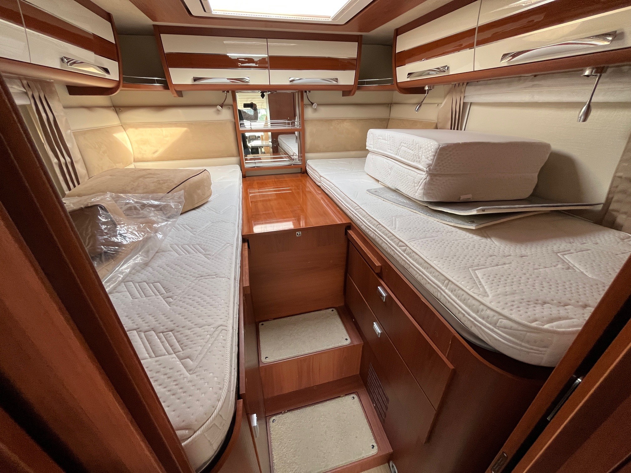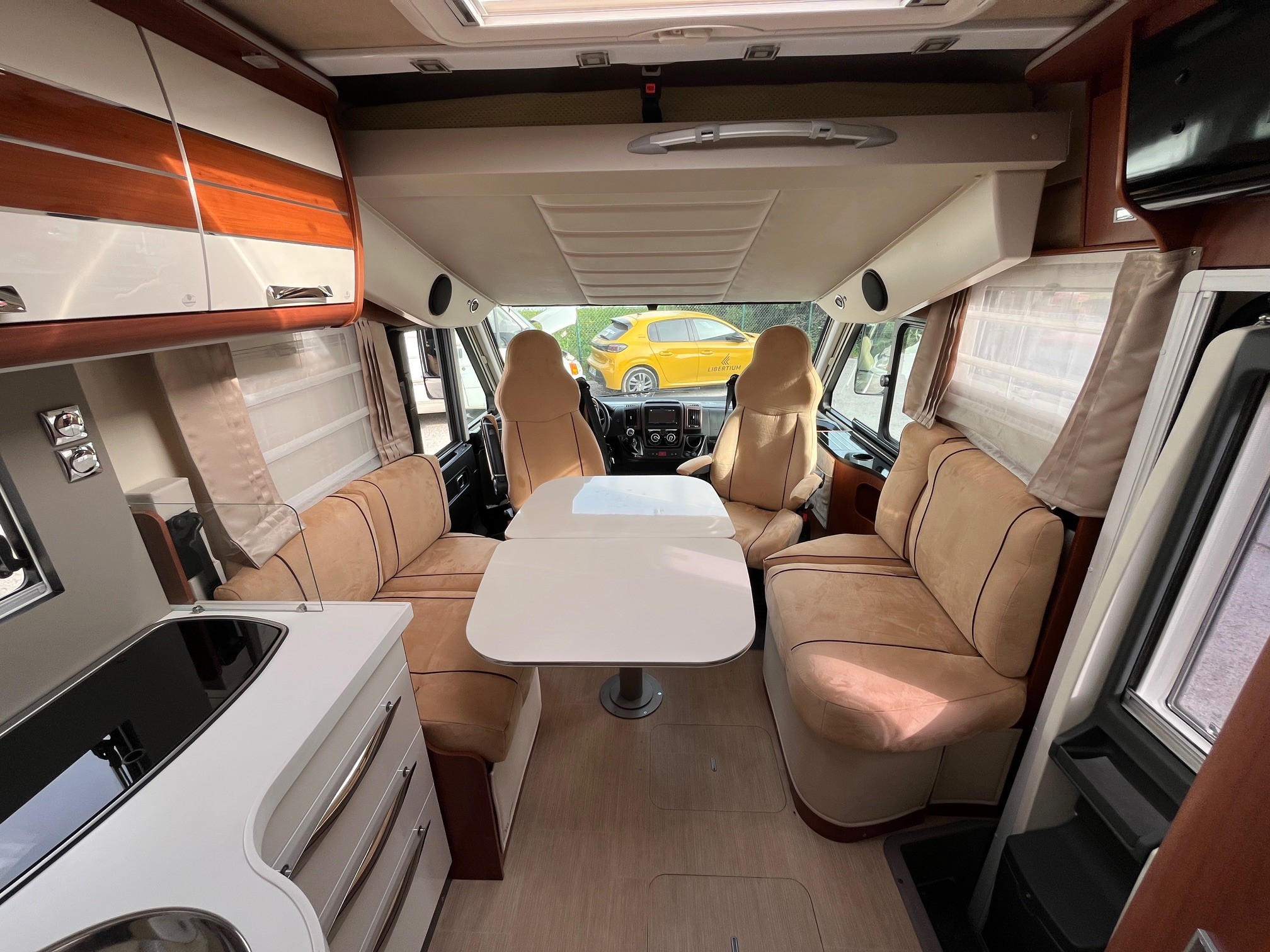 camping-car intégral haut de gamme offrant un grand confort avec salon spacieux, lits jumeaux et équipements premium. Long d’environ 7,5 m, il peut accueillir jusqu’à 4 personnes avec une excellente habitabilité et une forte autonomie