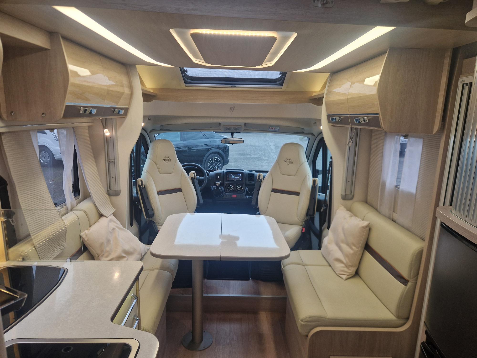 Profilé haut de gamme de marque leader, avec lit central et lit de pavillon électrique 2 places. Banquette face face, double cloisonnement, cuisine équipée d'un grand frigo, très bel état général. Sur une base Fiat 2.3 l / 130 CV. A découvrir chez votre concessionnaire LIBERTIUM Muret.