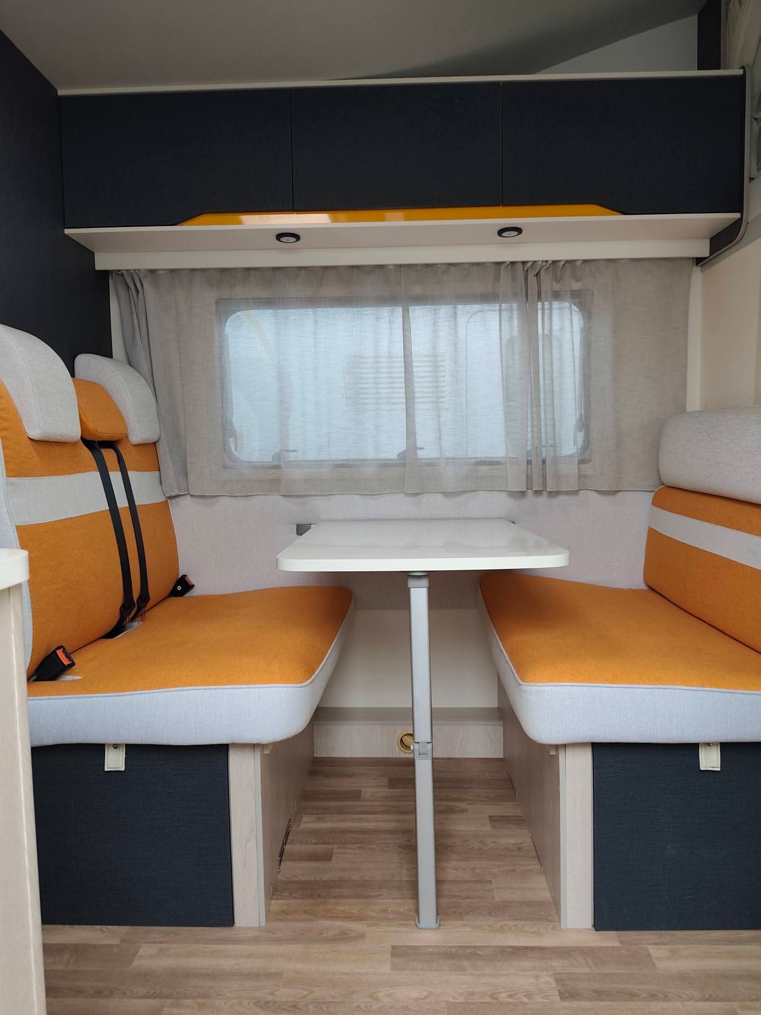 Nouveautés 2023-2024 • Modification complète des intérieurs • Assises de dînette ergonomiques avec appuie-têtes réglables • Nouveau pied de table sur demi-dînettes, avec système coulissant au sol • Nouvelle lampe tubulaire de garage amovible, avec double fonction de plafonnier et de « lampe de poche » • Nouvelle rallonge de banquettes coulissante, avec panneau intégré • Nouveau levier externe pour la transformation des banquettes face à face easy-road • Repositionnement du coffre à gaz, plus bas, afin de faciliter le chargement