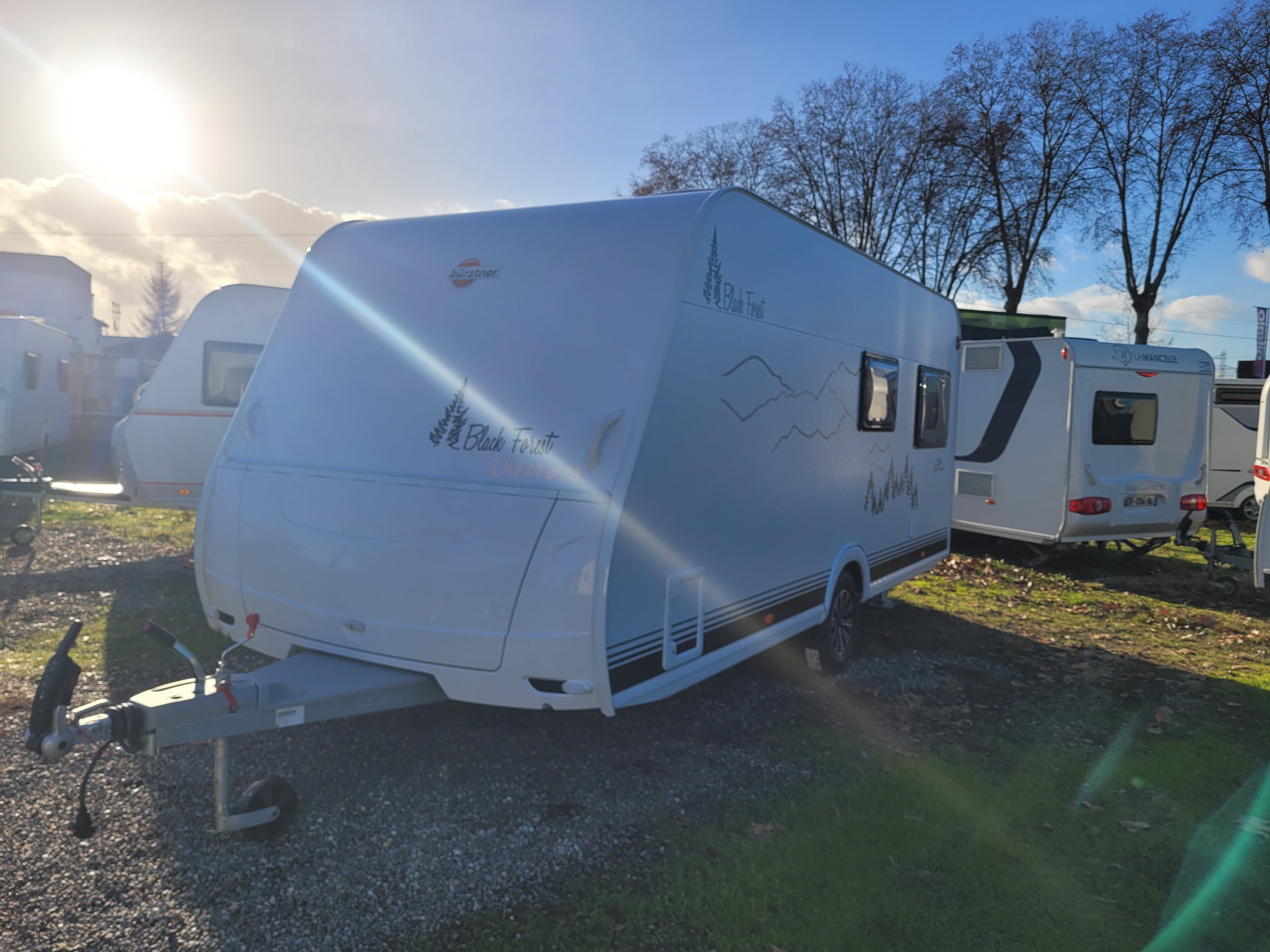 "Le Bürstner Premio 455 TS d'une longueur de 5,59 mètres possède un lit français à l'avant qui mesure 205 x 144/105 centimètres. Il y a un grand salon en forme de U à l'arrière, un réfrigérateur de 142 litres, une cuisine en face et un coin buanderie ouvert. Profitez ici d'une finition particuliere ""Black Forest"".Il comprend des jantes en aluminium, un cache-flèche, une carrosserie à martelage fin, des vérins de stabilisation renforcés avec semelles ainsi que l'équipement complet Black Forest : graphisme extérieur, sellerie, rideaux, coussins, draps-housses et pochettes de rangement en feutrine"
