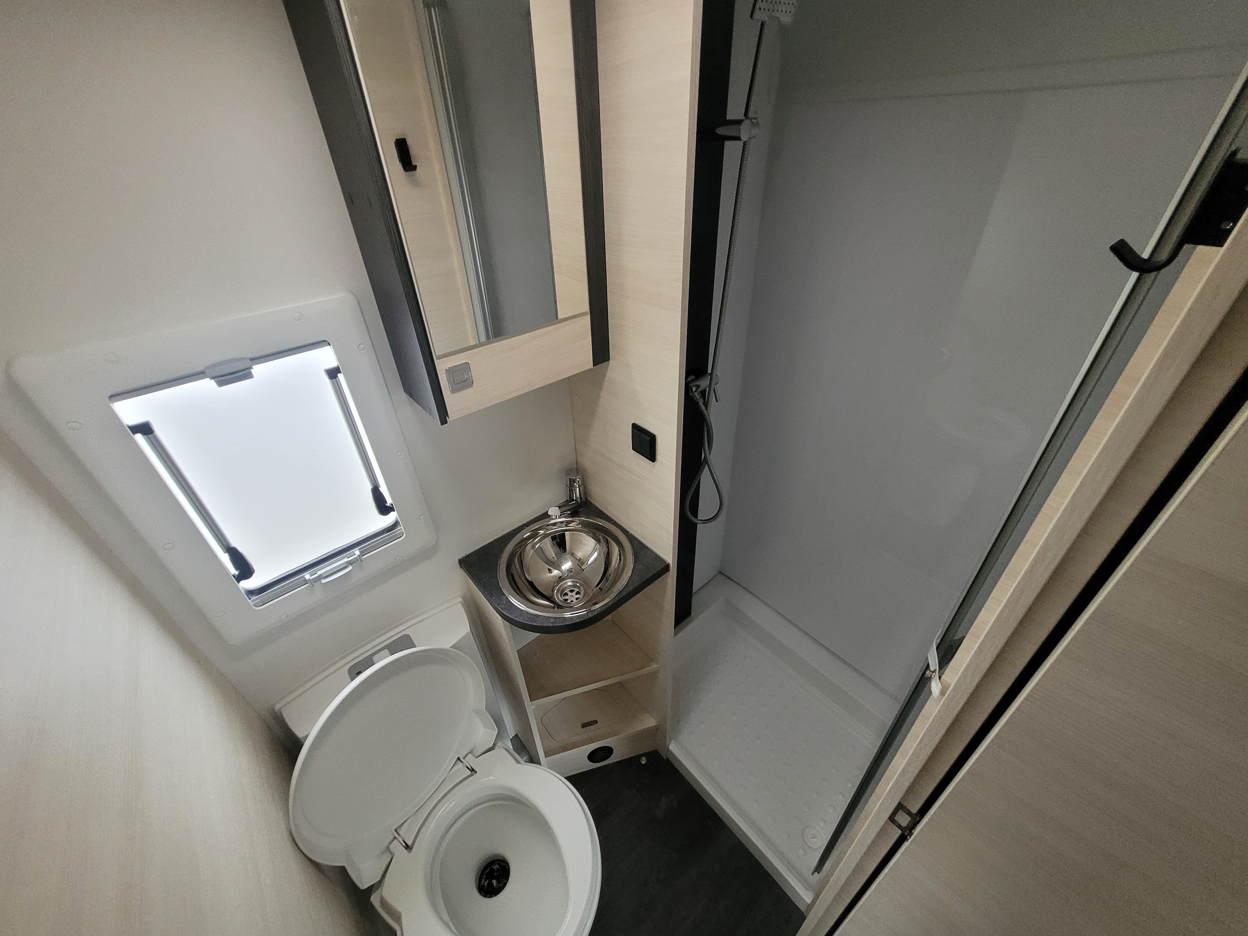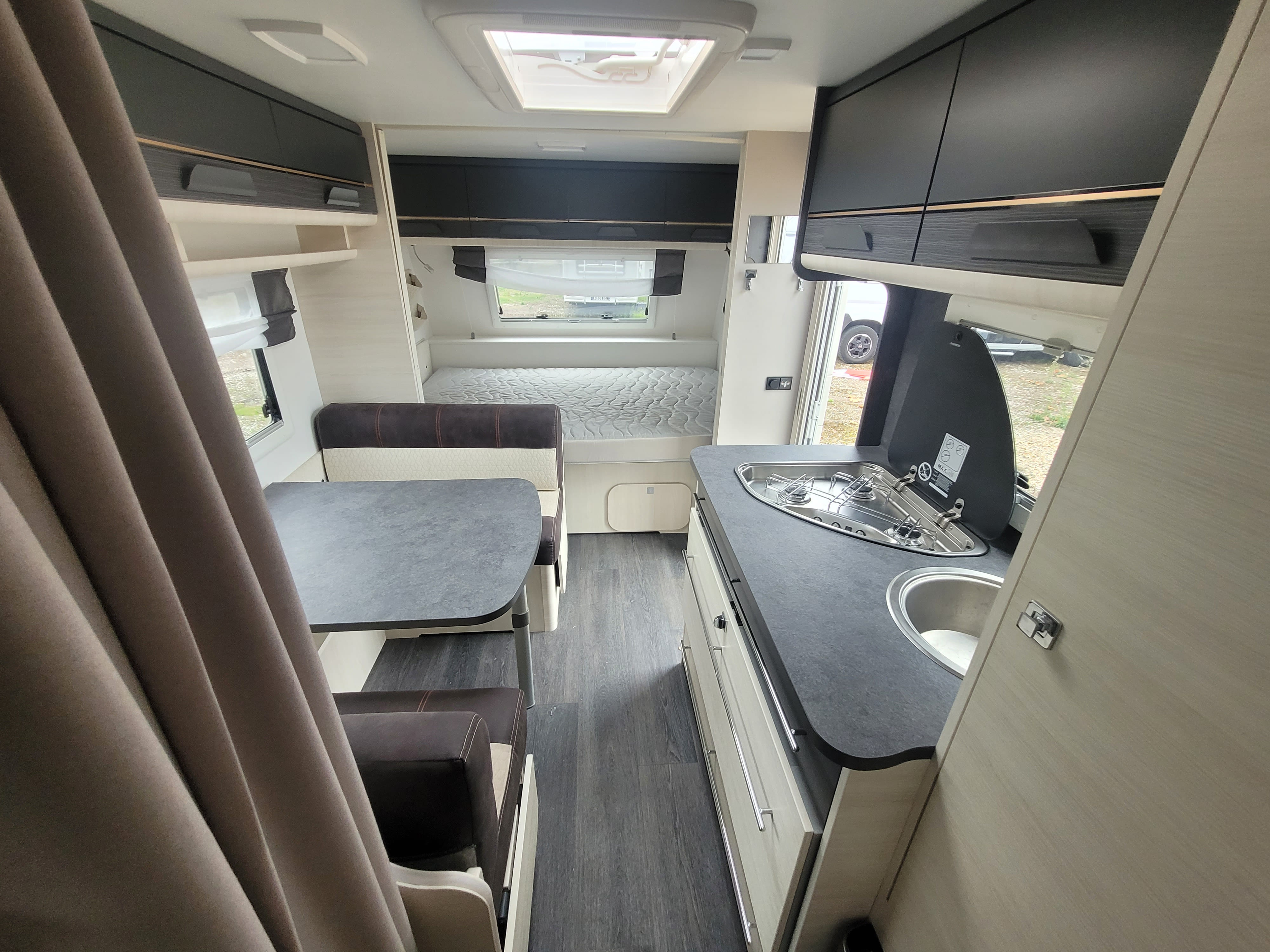 Caravane d'occasion récente en très bon état pour une famille de 6, avec douche indépendante de la marque Caravelair