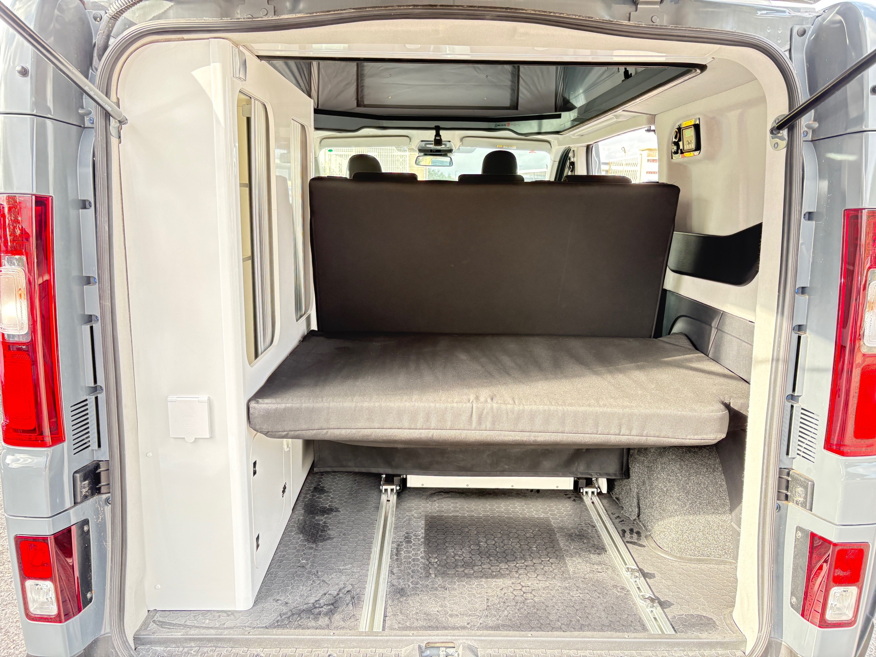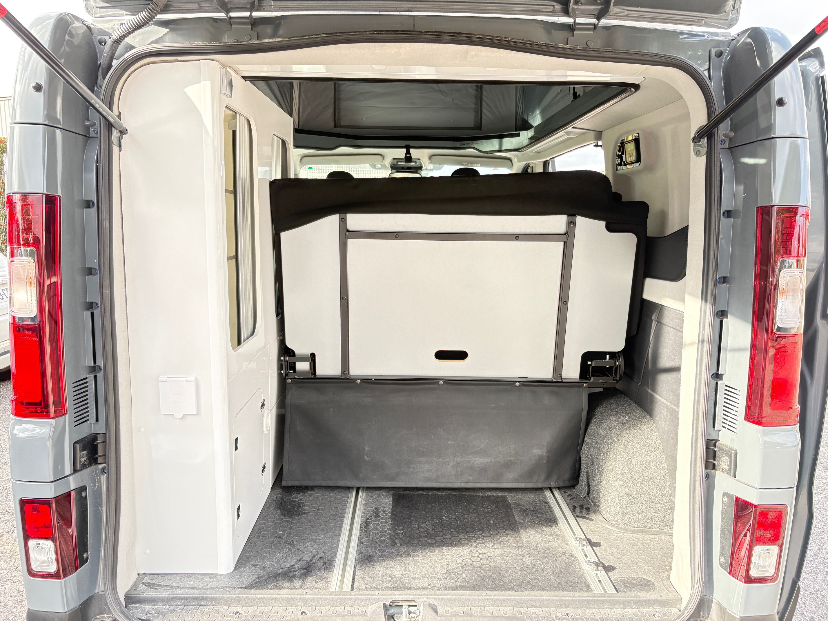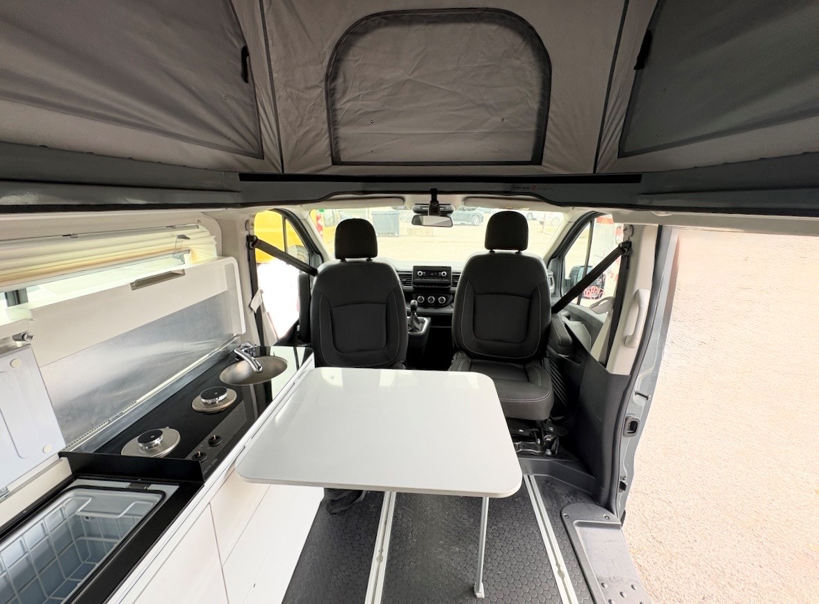 Renault Trafic Hélios Vario Camp by Adria, motorisation 150 ch boîte automatique, élégant gris Lanzarote. Aménagement intelligent avec lit bas + lit relevable, isolation renforcée pour un confort toute saison. Équipements premium : jantes alliage 17”, volant multifonctions, climatisation. Un van polyvalent, idéal pour voyager confortablement sans compromis sur le style.
