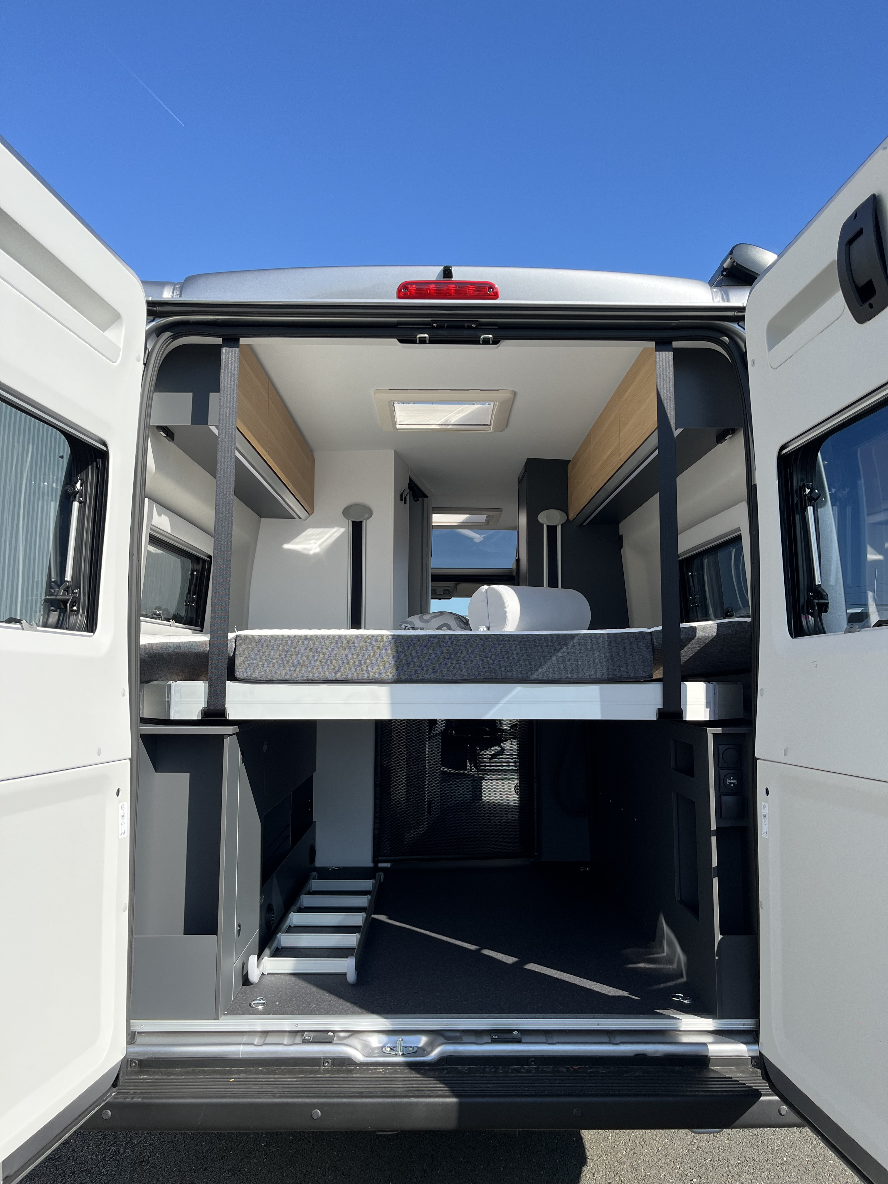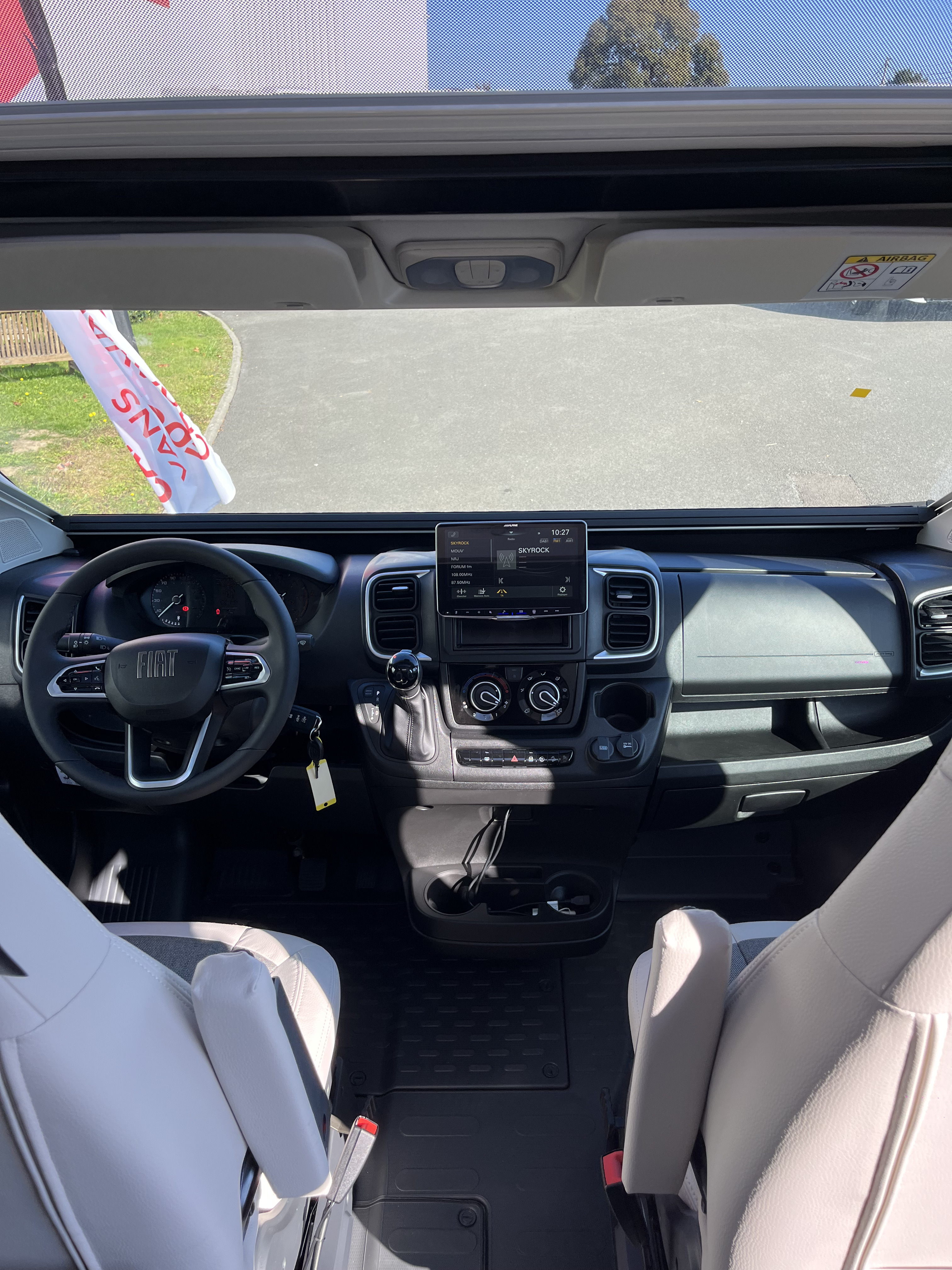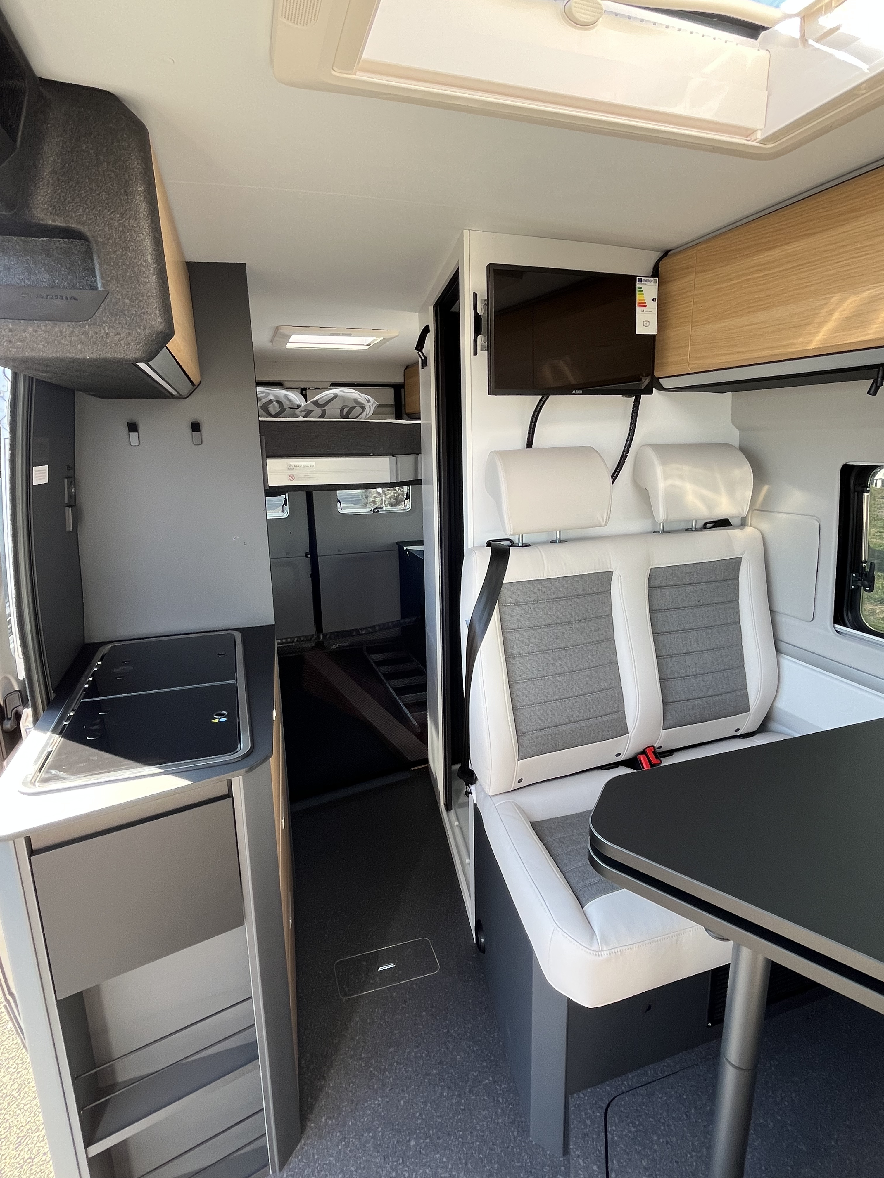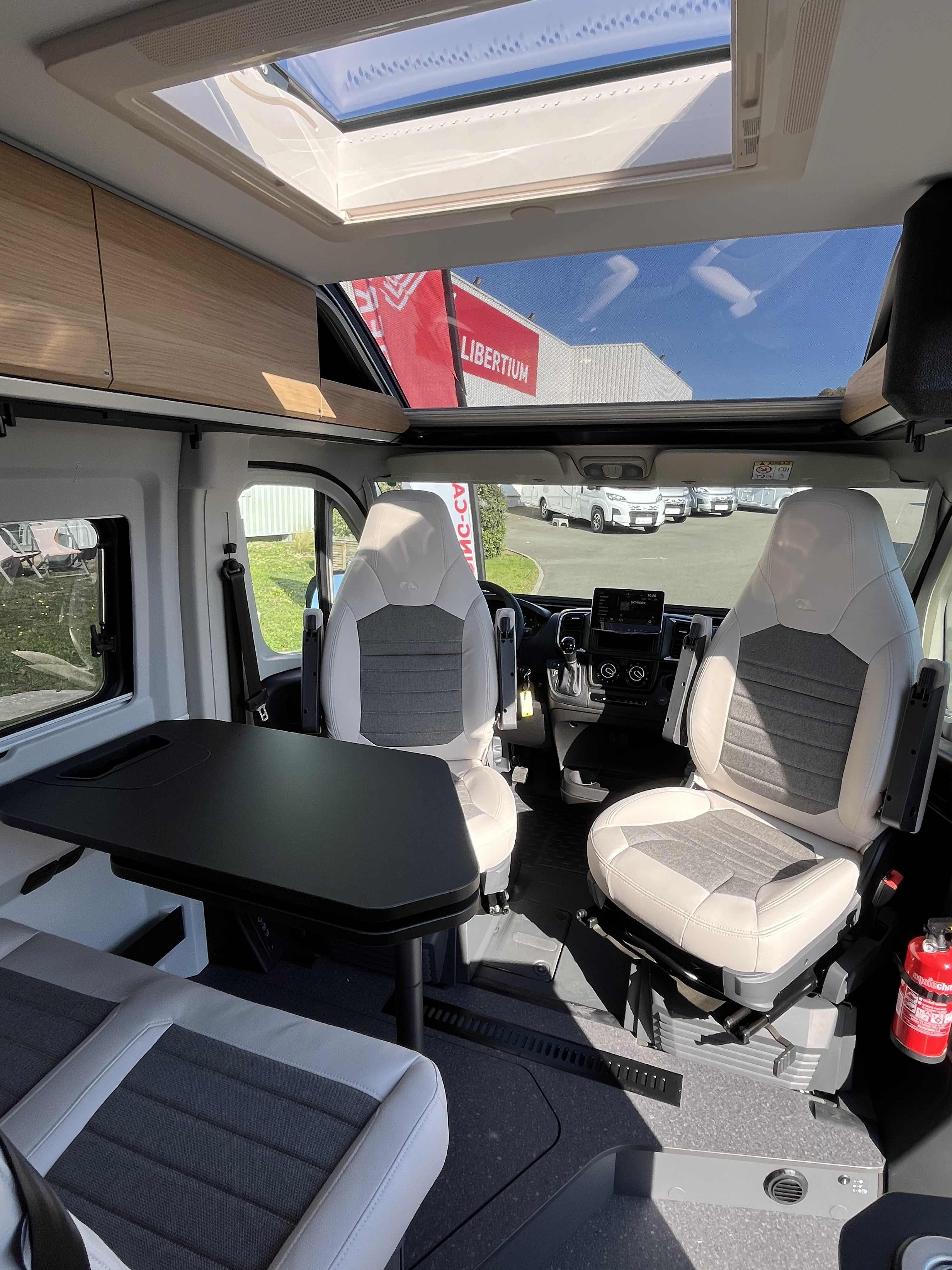 - Store d'occultation pare-brise et fenêtres latérales cabine Porte cellule avec moustiquaire, Marche-pied électrique Toit panoramique en cabine avec occultant Store extérieur Anthracite 3.75 M