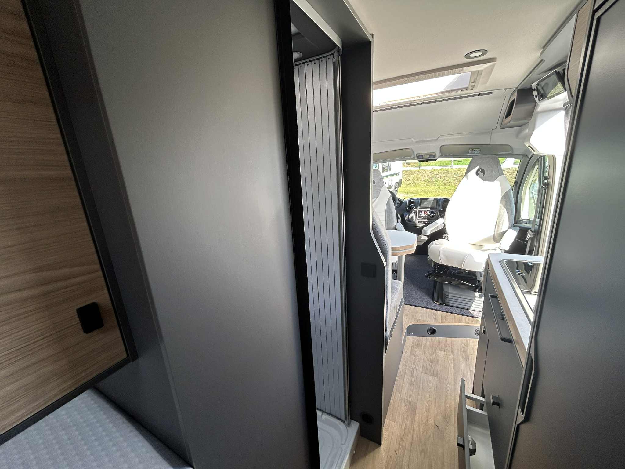 Le fourgon aménagé Bavaria K630J offre une cuisine fonctionnelle avec cinq tiroirs compartimentés et une poubelle intégrée, assurant un rangement organisé pour vos ustensiles. Son cabinet de toilette 3en1 est à la fois pratique et ergonomique, offrant des commodités essentielles en un seul espace. De plus, les lits jumeaux modulables permettent de créer une grande soute pour le stockage de vos équipements. Avec les baies latérales de série, vous bénéficiez d'une luminosité naturelle et d'une vue panoramique. Ce fourgon aménagé allie fonctionnalité et confort pour une expérience de voyage agréable.